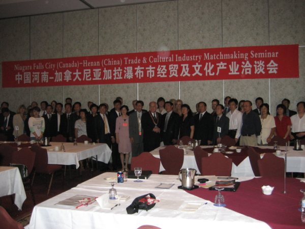 應加拿大尼亞加拉瀑布市市長R.T.(TED)Salci的邀請,由河南省文聯吳長忠主席為團長,中國貿易促進會河南分會吳永新處長等一行二十五人的河南省經貿及文化產業代表團,于七月二十九日到訪加拿大,在尼亞加拉瀑布市成功地舉辦了中國河南-加拿大尼亞加拉瀑布市經貿及文化產業洽談會。此次洽談會得到了河南省人民政府,中國國際貿易促進會河南分會,尼亞加拉瀑布市政府,尼亚加拉市商会,瀑布旅游局及加拿大加聯國際集團,加拿大中國專業人士協會等機構的支持與贊助。此次洽談會假座喜来登景觀酒店,參加洽談會的各界來賓近百人。會議由加聯國際集團王主席和尼亞加拉中心學院李院長共同主持。尼亞加拉瀑布市市長R.T.(TED)Salci發表了熱情洋溢的歡迎詞,衷心祝願這次洽談會成功。河南省文聯吳長忠主席在致辭中表示,希望借此次洽談會為契機,進一步開展並加強中加兩國, 河南省和安省,河南和尼亞加拉市之間經貿及文化產業的合作。與會人士詳細地聽取了河南省的發展戰略和國際合作計劃,紛紛表示有興趣與河南建立聯係,信息互通,產業合作,共同發展。會議期間,初步探讨了多項合作意向。會後,河南省代表團一行應邀參觀訪問了加聯集團設在尼亞加拉市的總部,集團王主席,李院長再次對河南朋友表示熱烈歡迎,雙方都表示願意進一步加強合作。晚上,加聯集團設宴招待了河南代表團。次日,河南代表團離開加拿大回國。有关详情请浏览加联国际集团网站